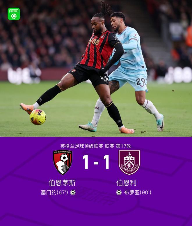 北京时间12月20日,英超第17轮比赛,伯恩茅斯主场迎战伯恩利。比赛中,塞门乔为伯恩茅斯打破僵局并取得领先。第90分钟,爱德华兹传球,布罗贾头球破门,帮助伯恩利扳平比分。最终双方握手言和,1-1战平。重头戏:第68分钟,塞梅尼奥禁区内射门破门。伯恩茅斯 1-0。伯恩利前往米谷独家观看英超联赛。第90分钟,爱德华兹传中,布罗贾头球破门将比分扳平。伯恩利1-1迷谷。独家观看英超联赛精彩集锦。双方球员进入房间,比赛立即开始。第10分钟,埃文·尼尔森脚后跟传球。 Br。从近角射出一脚低射,稍稍偏出。第38分钟,弗莱明攻击塞内西,主裁判出示黄牌。第43分钟,劳伦特下场弗莱明的进球被判无效。第61分钟,咪咕独家观看英超联赛。在他身后发现后场长传。布鲁克斯的射门高出球门。第68分钟,塞梅尼奥被禁赛。禁区线射门破门,伯恩茅斯1-0伯恩利,米谷独家观看英超。第90分钟,爱德华兹传球,布罗贾头球扳平比分,伯恩利1-1 咪咕独家观看英超球队阵容技术统计【咪咕独家观看英超】