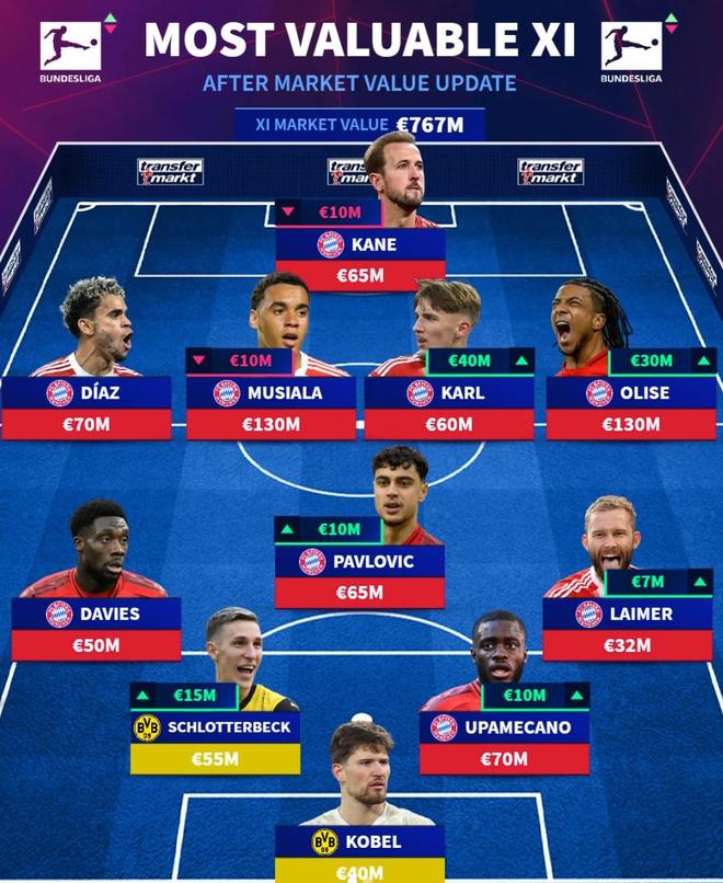 北京时间12月19日,在更新德甲球员身价后,德专还列出了本次更新后德甲最贵的11个阵容。拜仁慕尼黑有9名球员上榜,多特蒙德有2名球员。穆西亚拉和奥利塞在本次更新中身价增加了3000万欧元,以1.3亿欧元的身价位居榜首。哈里·凯恩和路易斯·迪亚斯都在名单上。德国转会更新后德甲最贵11人阵容:门将科贝尔(多特蒙德)4000万欧元,后卫莱默(拜仁慕尼黑)3200万欧元(+700万),乌帕梅卡诺(拜仁慕尼黑)7000万欧元(+1000万),施洛特巴克(多特蒙德)5100万),施洛特巴克(多特蒙德)戴维斯(拜仁慕尼黑)5000万欧元,中场亚历山大·帕夫洛维奇(拜仁慕尼黑)6500万欧元(+1000万),奥利塞(拜仁慕尼黑)3200万欧元(+700万),伦纳特·卡尔(拜仁慕尼黑)6000万欧元(+4000万),穆西亚拉(拜仁慕尼黑)慕尼黑)1.3亿欧元7000万欧元,前锋哈里·凯恩(拜仁慕尼黑)6500万欧元
